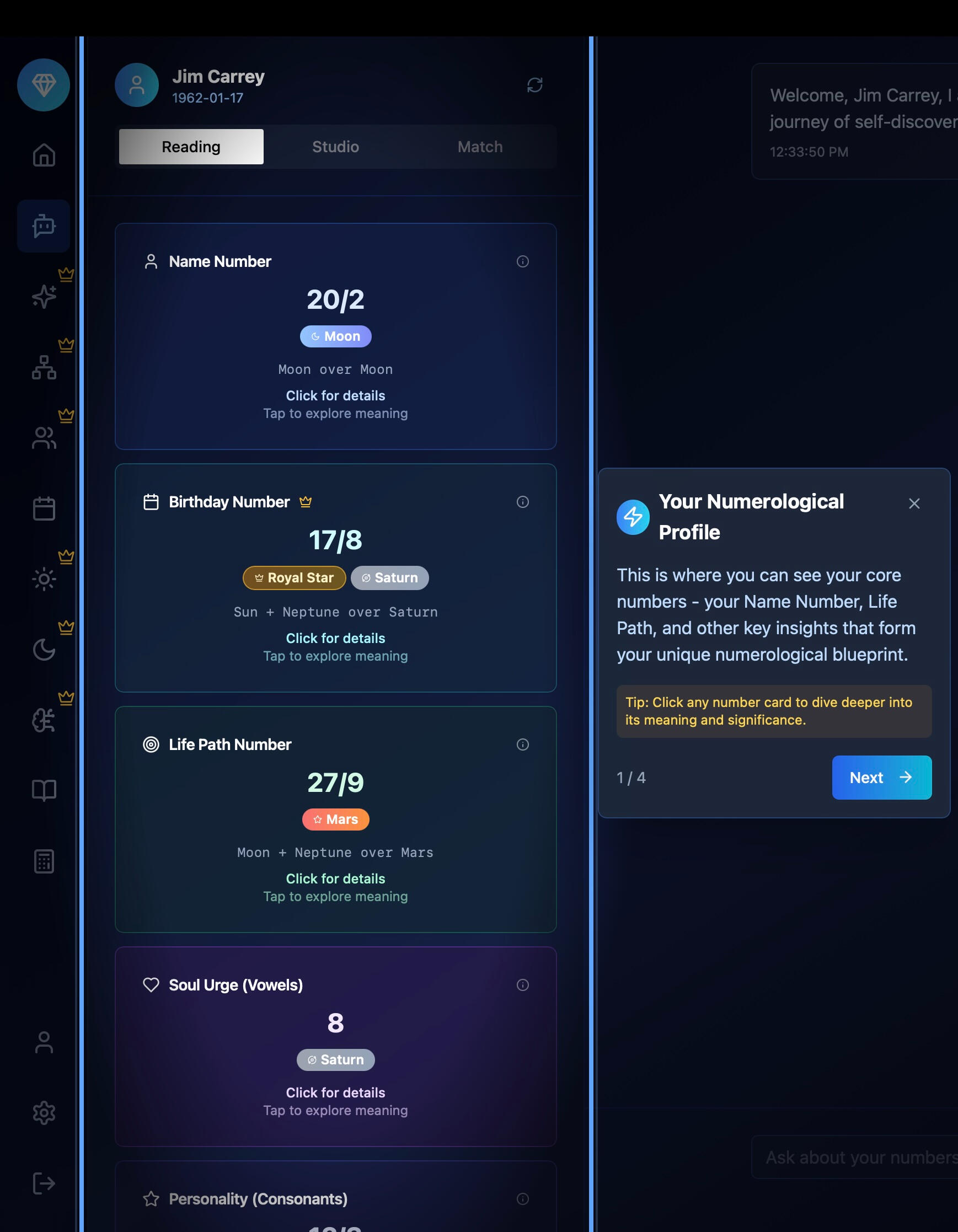 This is a view of your personal cards. You can uncover insights about your name, Lifepath, Hearts Desire and Personality.