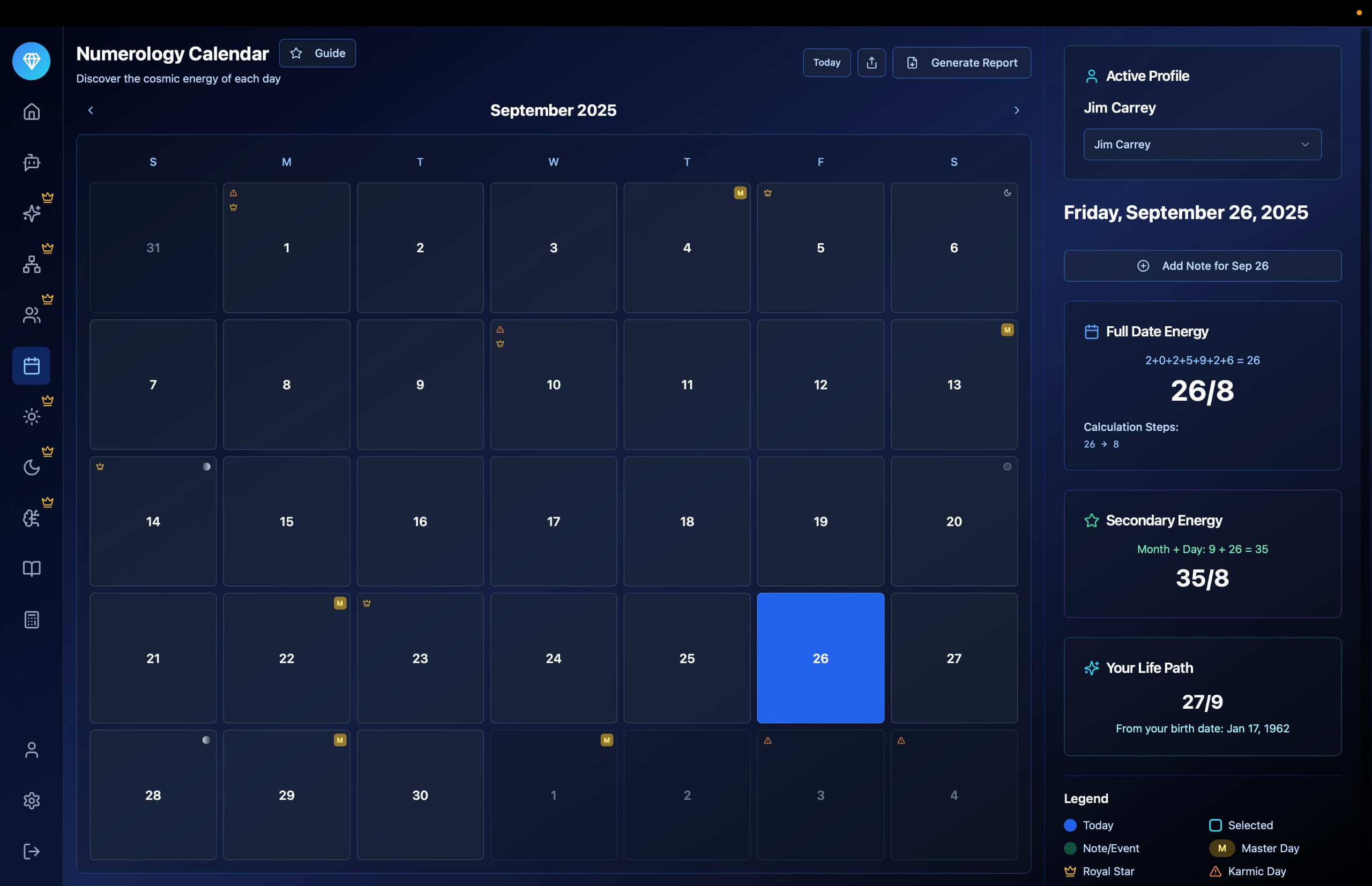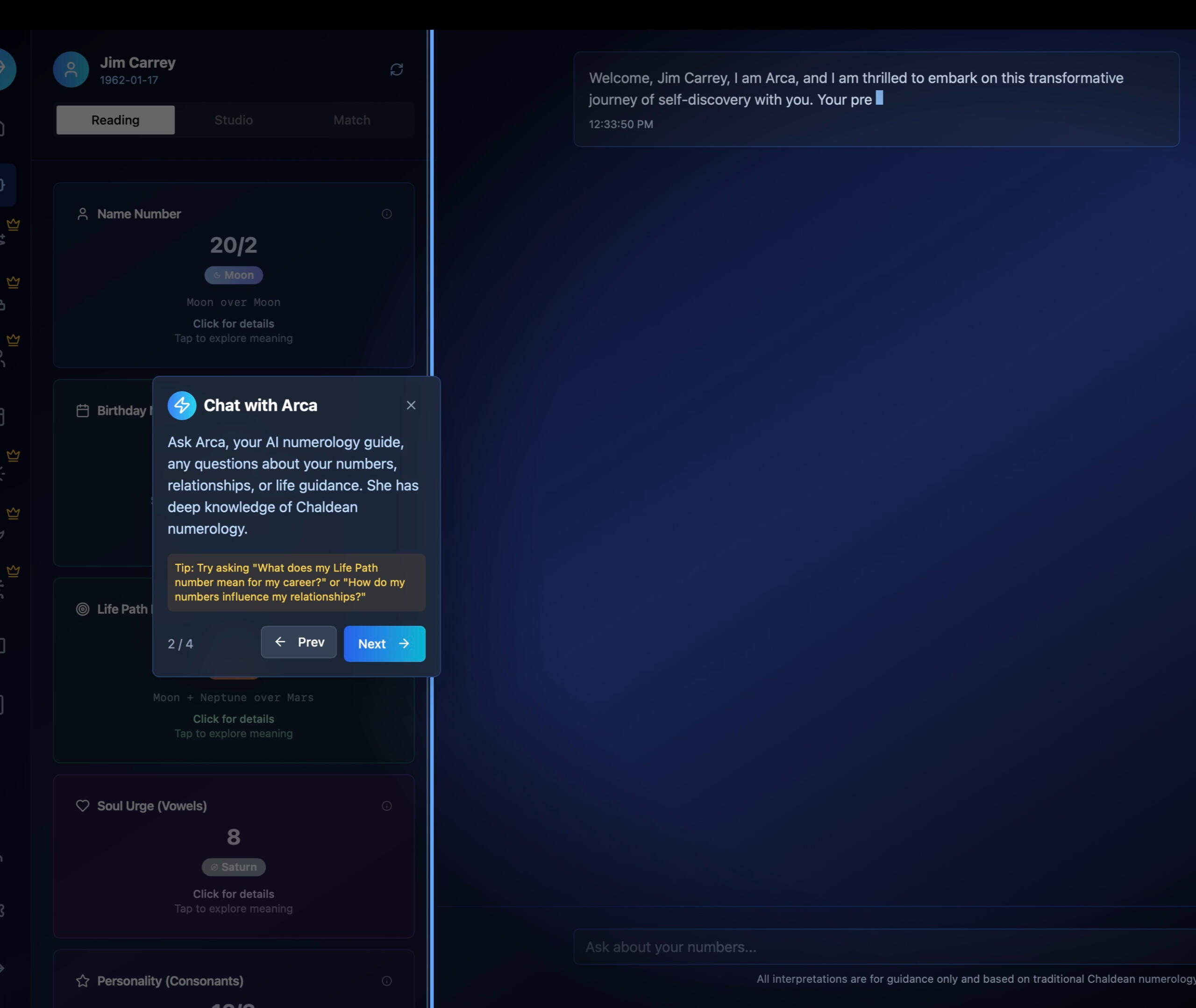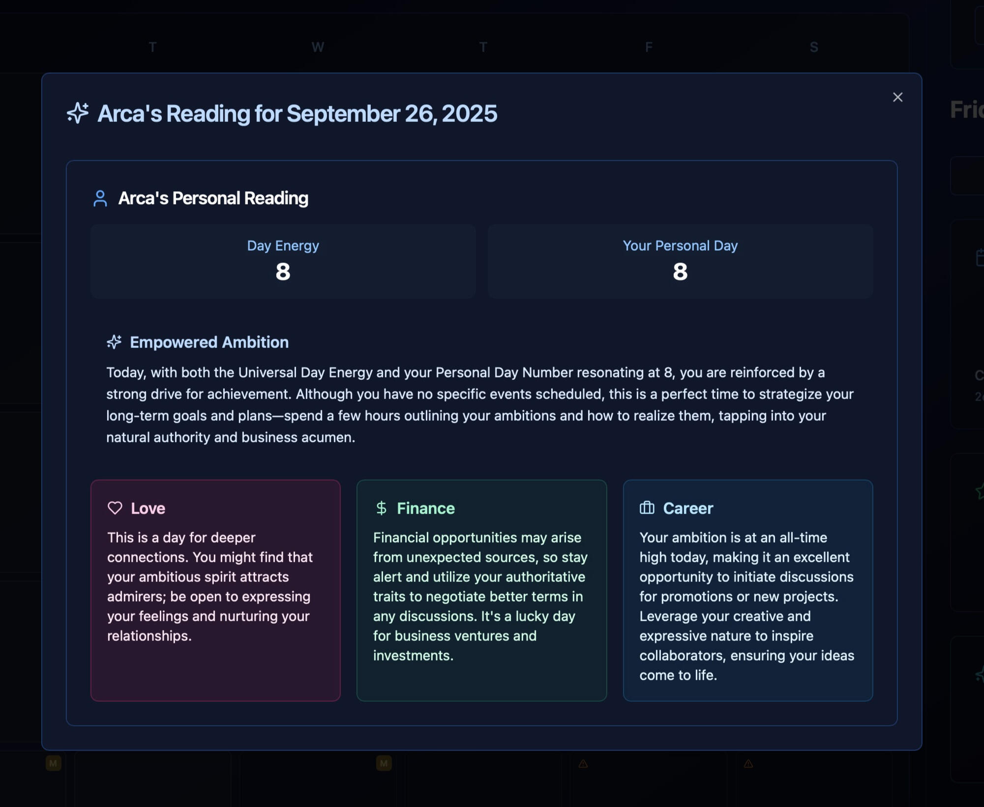 Gain personalized numerology insights for the current day or weeks ahead. Generate PDF Reports into the future! Add personalized notes and Arca will tell you how your personal and collective energy work together.
